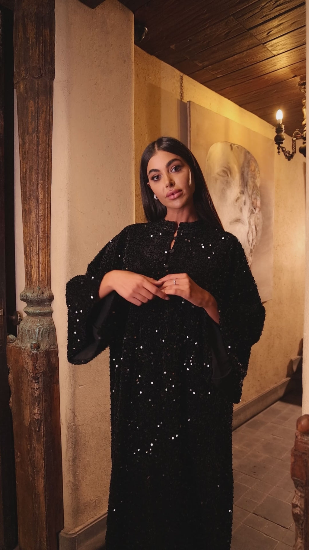 The perfect sequin velvet caftan dress is a glamorous and luxurious ensemble that exudes festive elegance, perfect your the holidays!