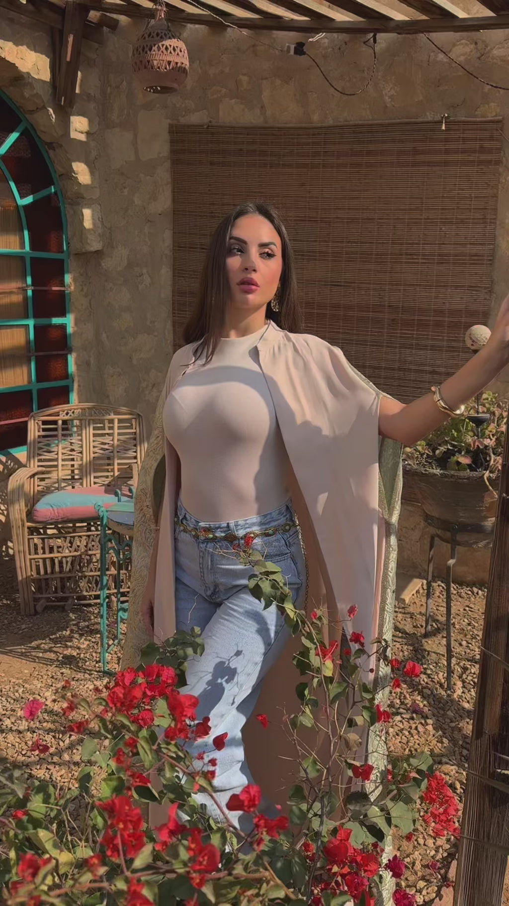 The Muheira Ivory Cape silhouette drapes beautifully over any outfit, making it perfect for layering over casual or dressy looks. Lightweight and breathable, it transitions seamlessly from day to night.